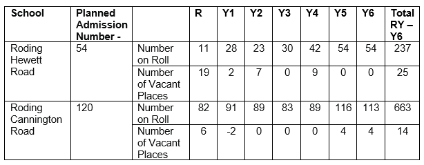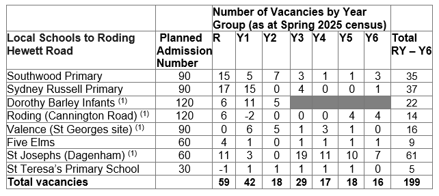 There are sufficient places available in other primary schools within a reasonable distance of Roding Primary Hewett Road. As of September 2025 the Synergy System shows the number of pupils on roll and vacancies at schools based on the school’s capacity for each of the Roding Primary schools’ sites are as follows: